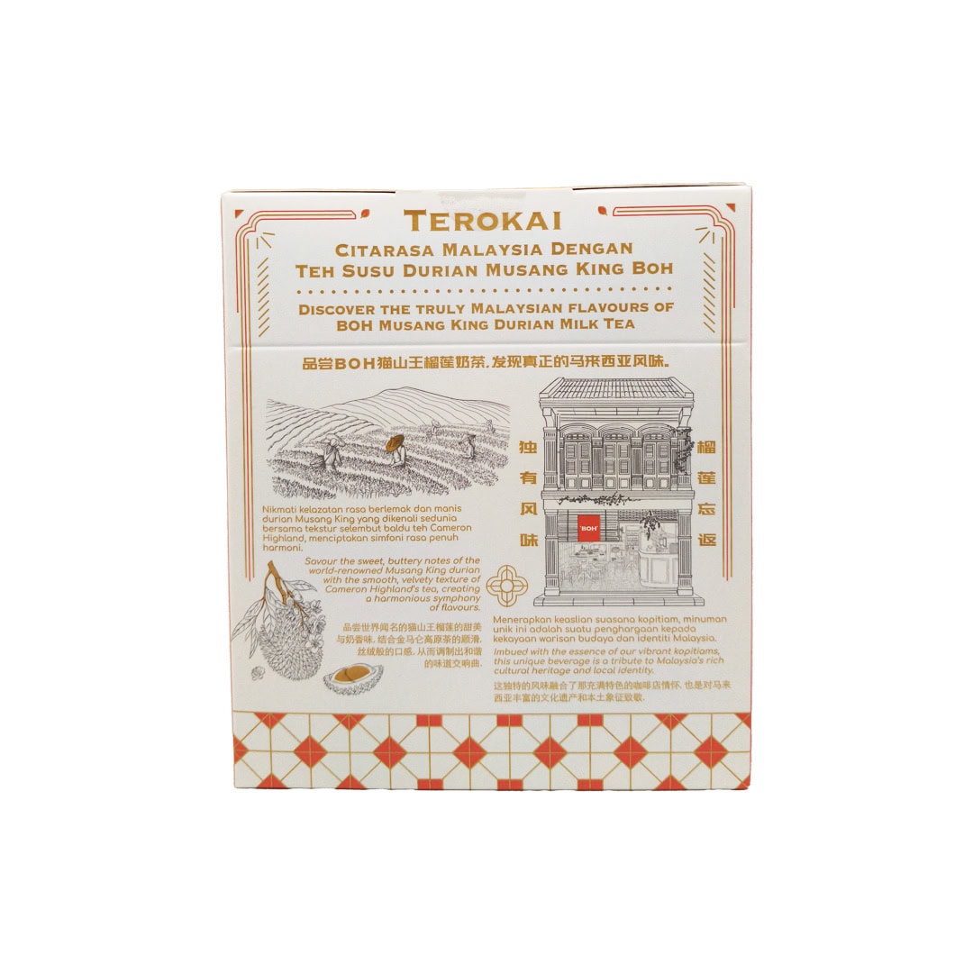 Made with durian extract with the taste of Musang King and BOH?s signature 3-in-1 Milk Tea blend.