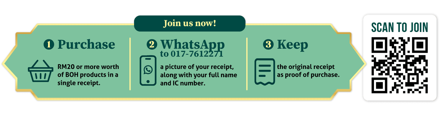 Purchase RM20 or more worth of BOH products in a single receipt.