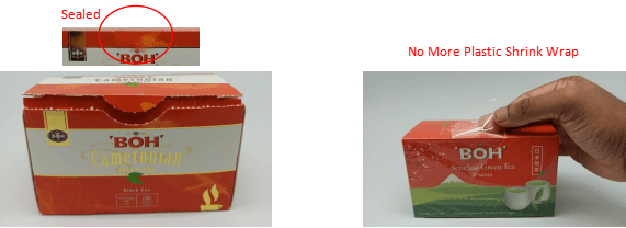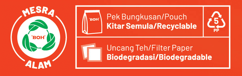 The BOH Mesra Alam (Environment Friendly) Logo will be printed on BOH products with an indication on what part of our product us recyclable or biodegradable.